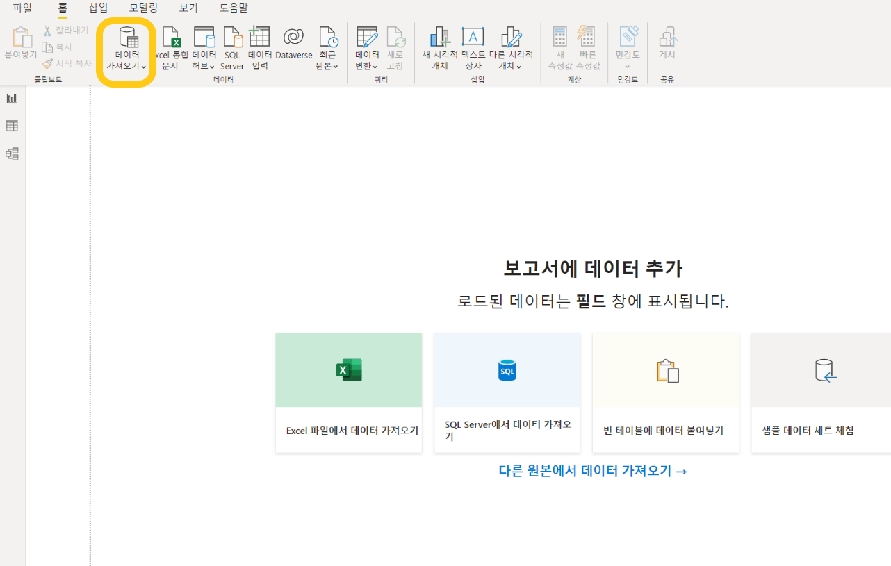 파워bi에서 데이터를 연결하기 위해서는 홈-데이터가져오기를 클릭합니다.