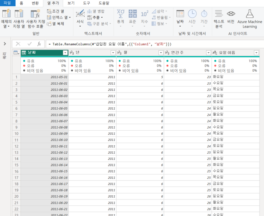 -열추가->날짜를 클릭하면 년/월/연간주/요일까지 설정가능하다